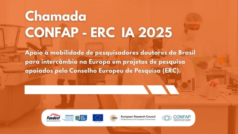 Mobilidade para pesquisadores integrarem projetos financiados pelo Conselho Europeu de Pesquisa (ERC)Apoio para o intercâmbio de pesquisadores doutores brasileiros, para integrarem equipes de pesquisadores na Europa com projetos financiados pelo Conselho Europeu de Pesquisa. A Secretaria de Estado de Meio Ambiente, Desenvolvimento, Ciência, Tecnologia e Inovação, Produção eAgricultura Familiar (SEMADESC), por meio da Fundação de Apoio … Continue lendo CONFAP – ERC IA 2025